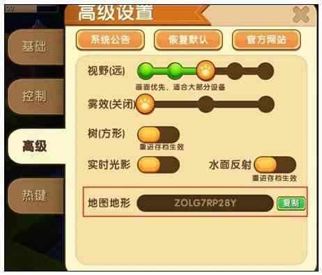 地形码其实(qishi)就是我们(us)常说的地图(map)种子,在游戏中(zhong)的(de)【游戏设置(set up)】-【高级】可以找到(zhaodao)地图(map)地形种子。