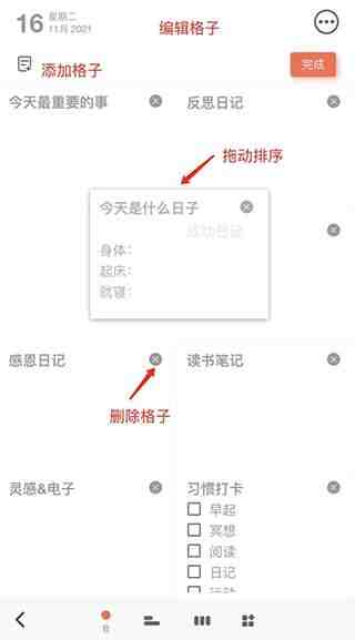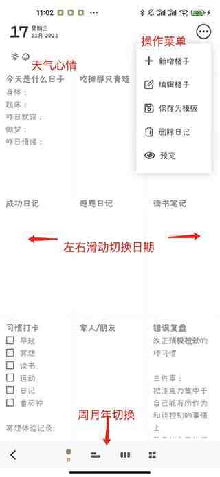 反思日记app使用教程:你如何看?主界面可直观查看每天的日记,左右滑动切换日期,可自定义编辑格式,拖动排序,点击修改内容,通过操作栏添加标签、图片等,往下看看更多的介绍吧。