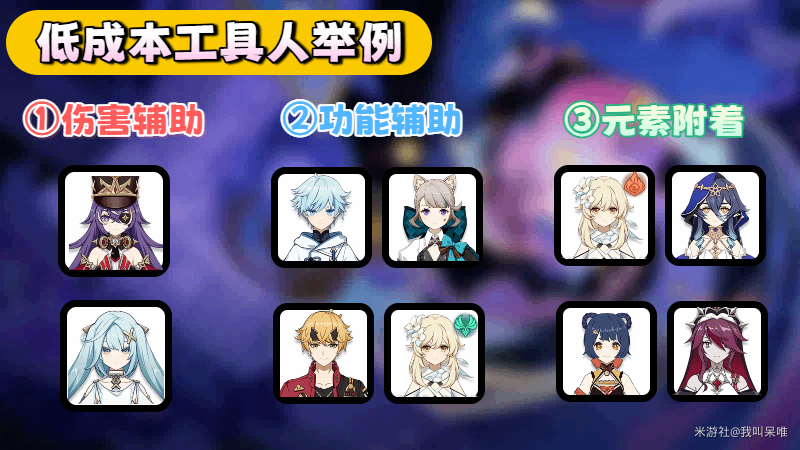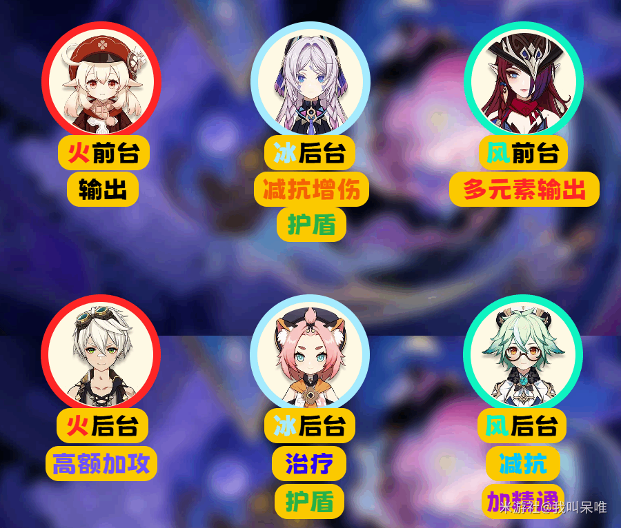 举例:火旅行者、香菱挂火;莱依拉、罗莎莉亚可挂冰;琳妮特、早柚能持续风元素攻击……