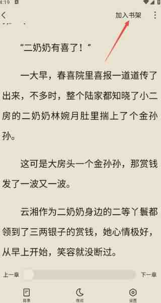 4、点击小说封面就(jiu)能进入(Enter)阅读界面(interface),左(zuo)右(you)滑动翻页,遇到喜欢的小说,还可以直接加入书架!