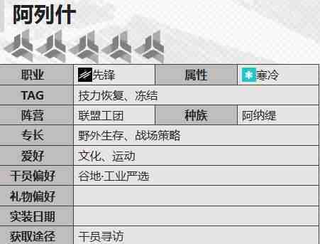 明日方舟:终末地阿纳缇成员阿列什指南那就会知道在游戏中有多个不同的种族。明日方舟终末地阿纳缇这是其中的一个,里面的成员不少,那今天所为大家介绍的就是阿列什。这一个先锋就会拥有记忆力恢复以及冻结的优势。不管是常规的推图,还是高难度的副本,下面就来跟随我们看下吧。