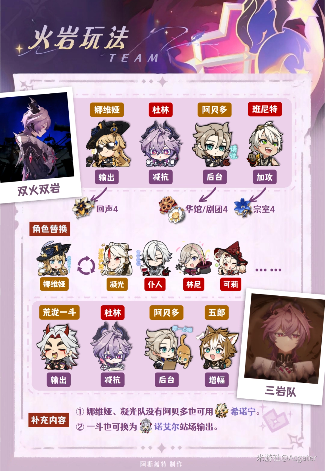 ④ 单魔导杜林也能与阿蕾奇诺、林尼、高命宵宫等火C组队,本质是三火一风纯火队的改良玩法,让杜林以“火副C+减抗位”的定位入队。