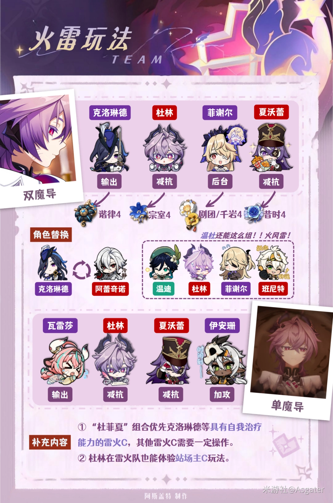 ④ 单魔导杜林也能与流浪者、魈组队,因为减风抗手段较少,所以入队当“火副C+减抗位”是一種拓展选择,但优先级不高。