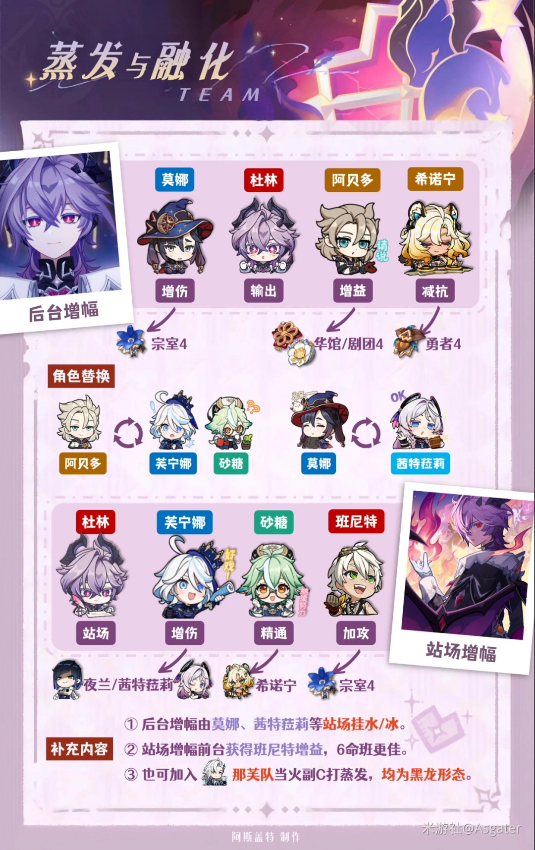 ① 因为仆人、宵宫的附着机制不能完全消耗水附着,通过引入黑龙杜林与剩余水附着触发蒸发丰富队伍输出。