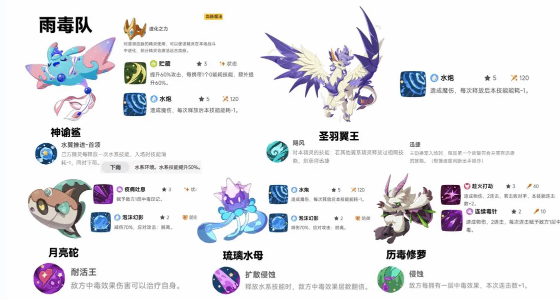 除了雨天泥沼队之外,玩家(player)也可以关注一下雨毒队。在雨天队的基础上,可以增加中毒的机制,拥有比较出色的容错率。核心的思路是首领化之后(hou)就会触发(trigger)下雨的效果,可以先给敌方挂中毒印记,接着琉璃水母就可以有效释放水系技能,让敌人的中毒层数翻倍。接着圣羽翼王靠着迅捷的技能就能有效补充伤害,这一套阵容不仅雨天的水系伤害加成可以提升,还会有持续中毒的伤害。面对肉盾阵容,也可以慢慢(manman)去磨,打起来真的还是比较稳的。