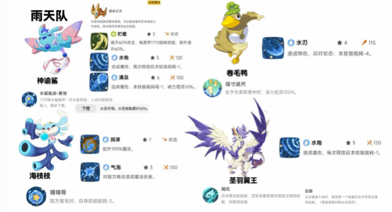 雨天队的配置主(zhu)要是围绕精灵下雨效果。除了彩蝶鲨,卷毛鸭也成为主(zhu)要的输出点。水刃在水系的环境中,威力直接翻倍,应对状态时,能耗就可以减4,配(pei)合(he)雨天buff就可以直接造成炸裂的伤害。圣羽翼王虽然是异系,但可以学水系技能水泡。主(zhu)要的特性就是飓风,还是比较适合这一套阵容。其他的精灵在放完相同技能之后(hou),就可以取得迅捷。更换宠物入场时就能释放符合能量要求的技能,收割残血的效率还是比较高的。然后搭配润泽技能,可以提升魔法(fa)攻击,整套阵容朴实粗暴,靠着高爆发就能打出伤害,不过缺点是容错率相对比较低。