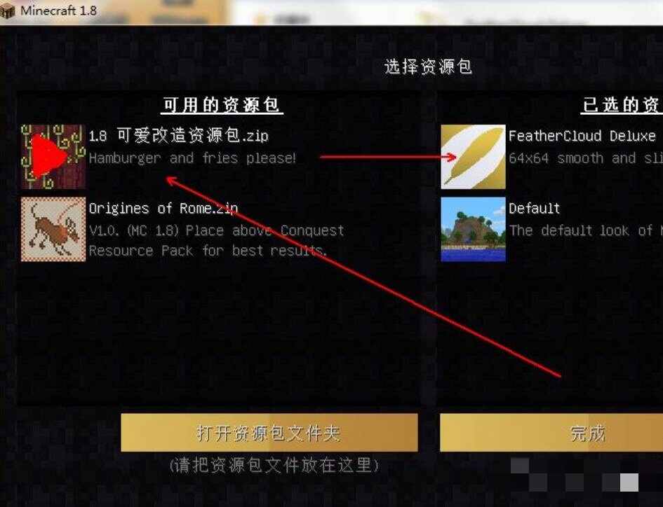 6.在资源包左侧,就能看(kan)到刚才添(tian)加(jia)的材质包【压缩包】。把鼠标移动材质包上就会显(xian)示(shi)【向右的小箭头】,点击就会将材质包添(tian)加(jia)至右侧材质栏里,最后点击【完成】保存(baocun)材质包,进入(jinru)游戏就会看(kan)到你刚刚换的材质包,图片所示: