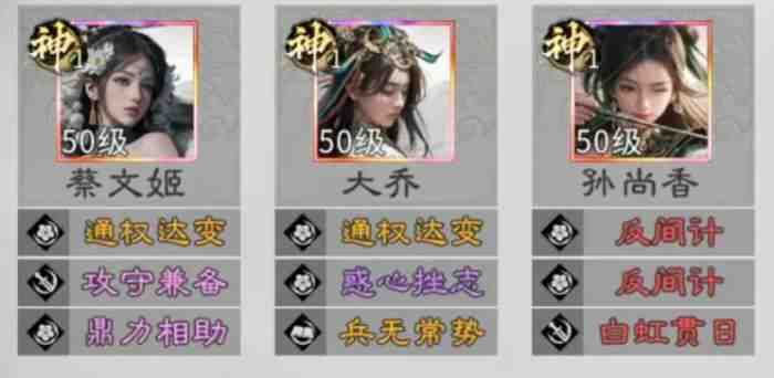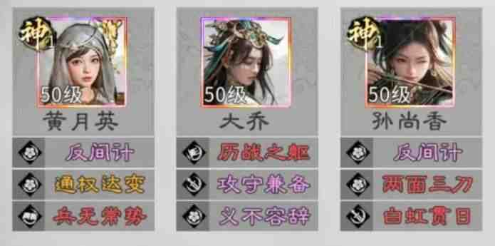 另外大家(jia)还要注意,这里三个女角色在进行搭配的时候,除了黄月英可以进行替代之外,小乔也是可以替换在其中的,这样大乔跟小乔之间一起上场的话,也可以保证阵容成型的速度,在这里造成追击的话其实在其中,利用孙尚香的枭姬被动技能也可以提升足够的暴击能力,这里只要是被对面给施加一定的负面状态,孙尚香就(jiu)可(ke)以(yi)带来这样的暴击加成,另外在她主动技能有一定追击次数的时候,发动的整体核心思路就是可以利用枭姬技能增强我方的发动回(hui)合(he),大乔跟小乔在这里同(tong)样都是带有负面状态施加能力的,所以在这里大乔跟小乔的辅助也是非常容易跟孙尚香搭配整体的一个阵容。