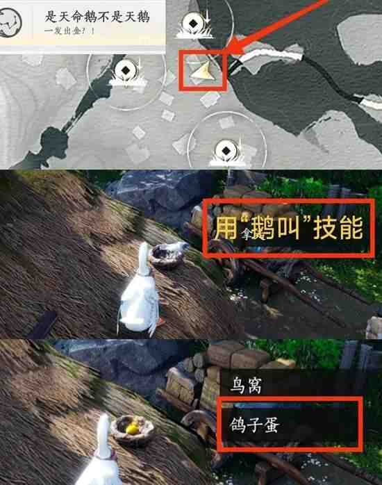 ⑥成就六“是天命鹅不是(no)天鹅”:在屋顶找到鸽子窝,用【鹅叫】技(ji)能(neng)吓鸽子获得金蛋,可唍荿姙務。