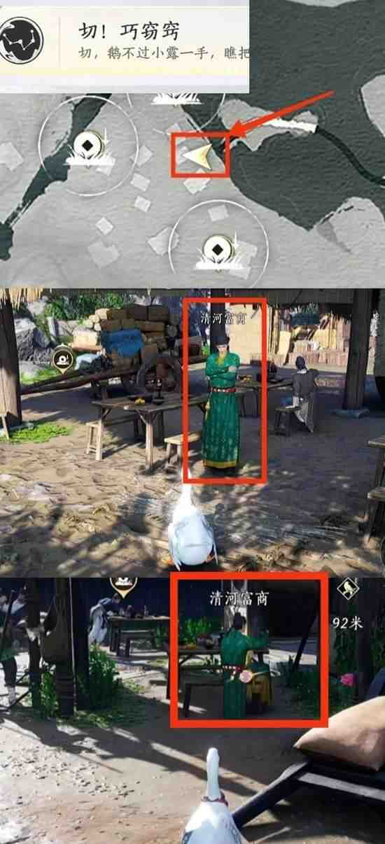 ⑦成就七“切,巧窃窍”:在酒棚附近(nearby)找到清河富商,尾随他直到他把八音窍放下。