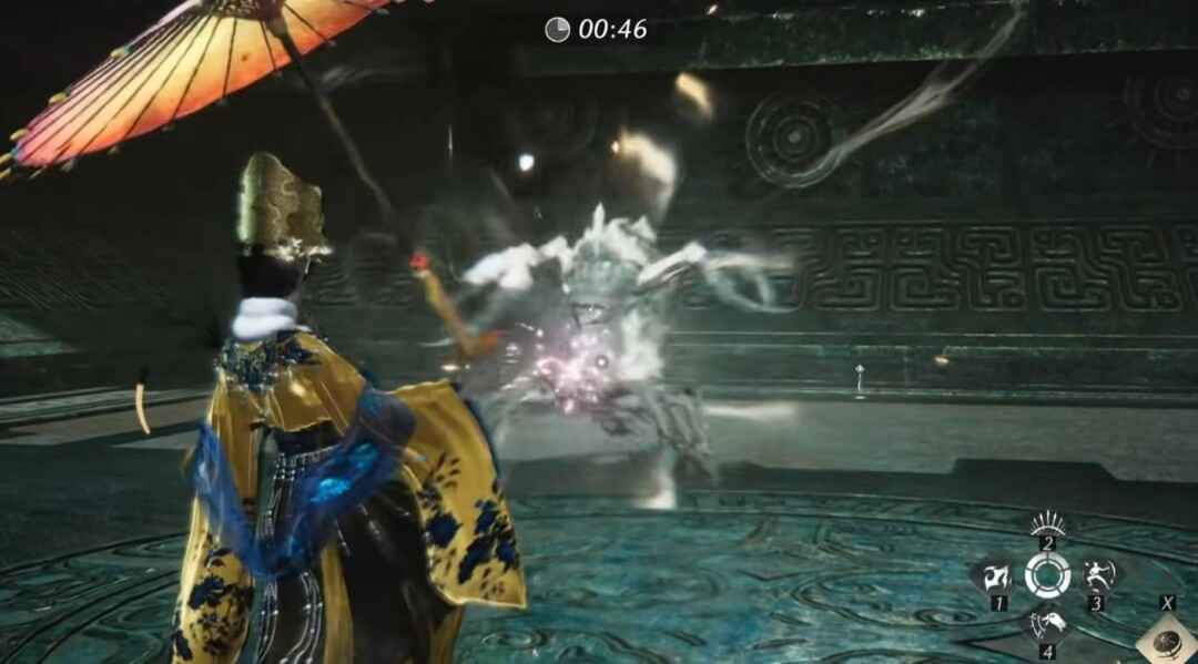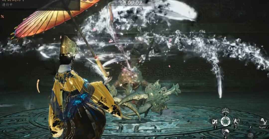 破盾后,立即切换唐横刀使用特殊技进行打断,然后切回伞,继续轻击蓄力输出并将其逼退,重新拉开距离。