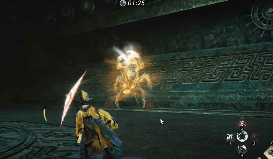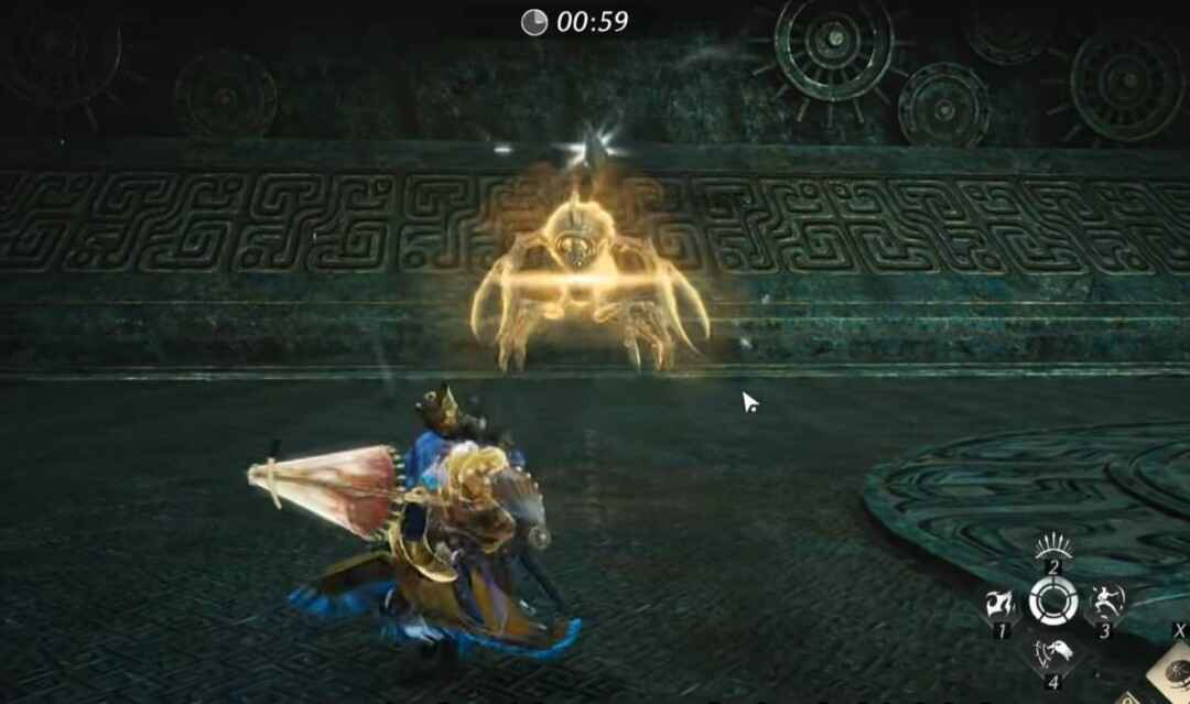 远程三连:当它双手张开、头部抖动泛金光时,会发射三次远程攻击,使用闪避躲开。