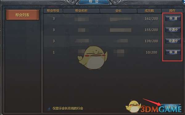 2、首先选择行会申(shen)请加入,管理员批准通過即可加入帮会