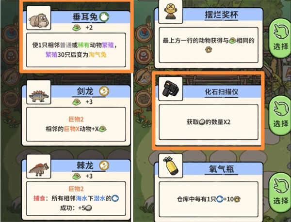 开局选择:动物选"垂耳兔"前期协助繁殖动物,道具选"化石扫描仪"加速凑齐1000化石。