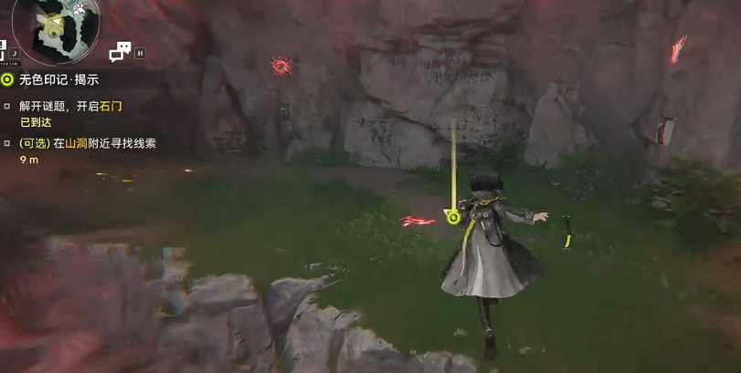 寻找印记:在障碍右侧墙壁找到小石头,点击调查发现无色印记