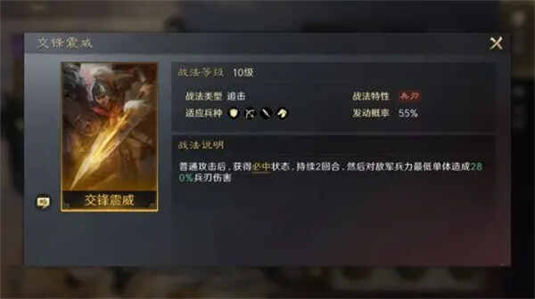 【交锋震威】:普(pu)通攻击后,取得必中状态,持续2回合,然(ran)后(hou)對敵军兵力最低单体造成280%兵刃伤害(harm)。