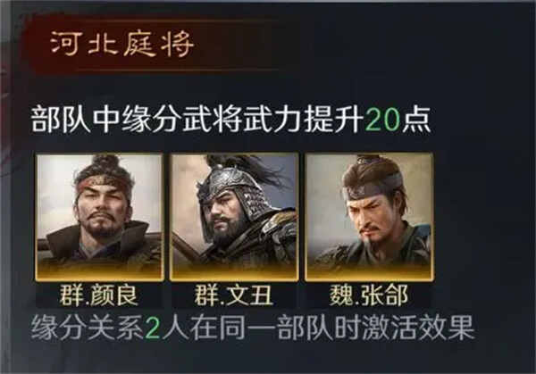1、河北庭将:部队中缘分武将武力提升(promote)20点。