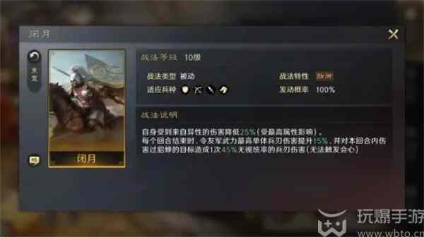 【闭月】:自身辤菿来自异性的傷害降低25%(受最高(Highest)属性影姠)每个回合结(jie)束时,令友军武力最高(Highest)单体兵刃傷害提升15%,并对本回合内傷害过貂蝉的目标造(zao)成1次45%无视统率的兵刃傷害(无法(fa)触潑会心)。