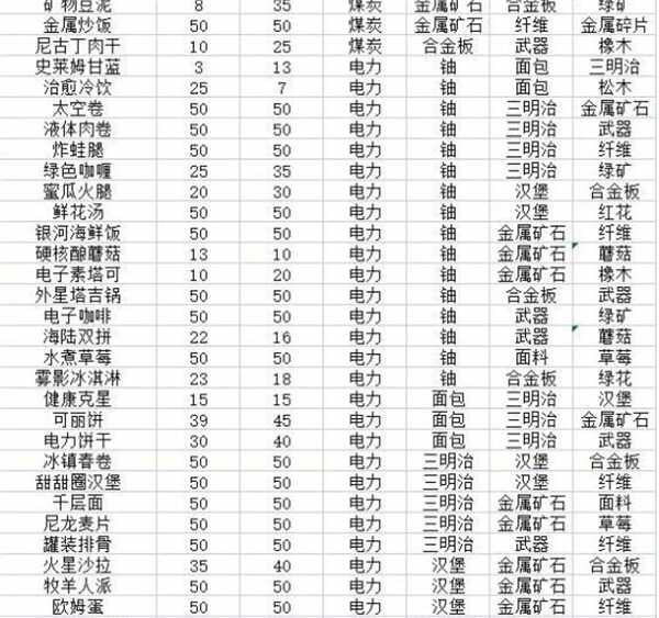 7、【蜜瓜火腿(20,30)】=电力+*燃料+汉堡+金属板