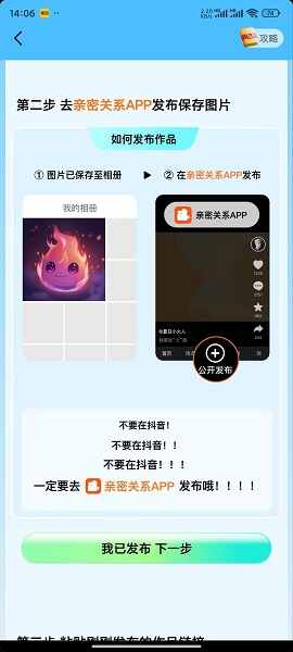 在抖音发布获得一张图片,去亲密关系app公开发布作品,復淛粘贴作品的链接回到(huidao)抖音!