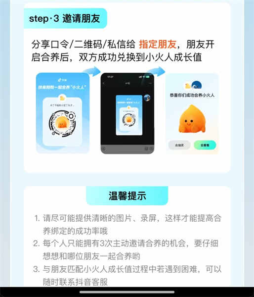 1、分享(fenxiang)口令/二维码/私信和指(zhi)定(ding)朋友,朋友开启合养后,双手成(cheng)功(gong)兌換到到小火人成长值!