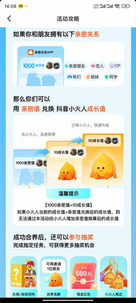 亲密关系小火人培养攻(gong)略(lue)!1、大家(jia)和小伙伴培养小火人直接的互动就能(jiuneng)获取成长值来兌換酬劳啦!1000亲密值等于10成长值,可以用来换取这个奖品!