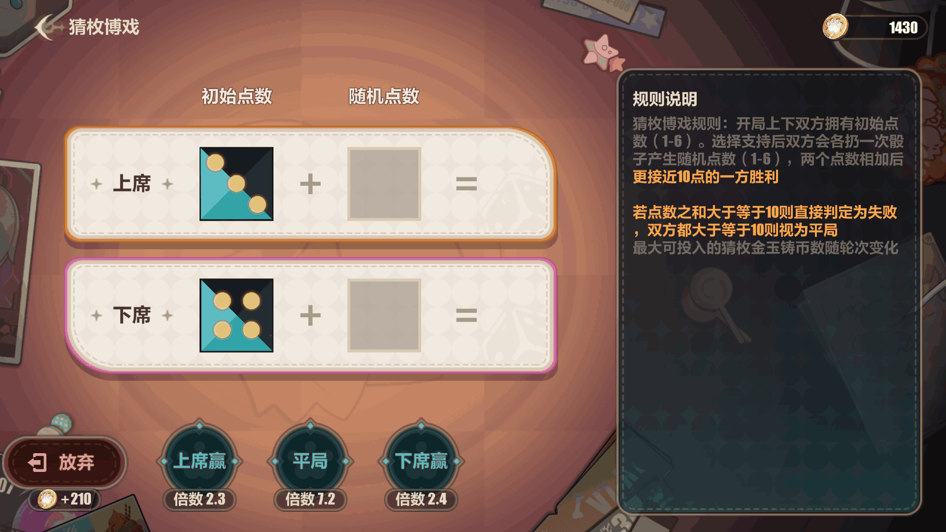 投注上下两席的投掷结果(guo),骰子点数之和接近10者获胜,点数相同或均超过10点即为平局。猜对获得金币奖励,猜错失去投注金币。