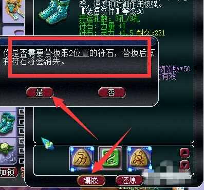 将新符石放上之後,点击镶嵌,在弹出的说明中点击“是”,则旧的符石消失,新(xin)的生效。