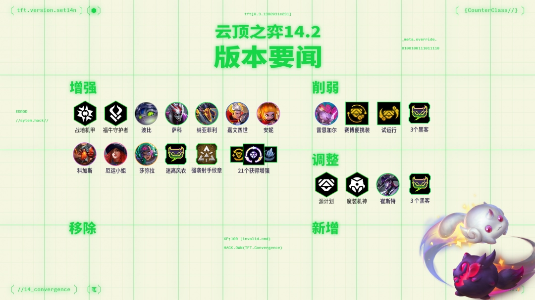 云顶之弈14.2BUG修复介绍这次更新有许多英雄进行了调整,还有不少的羁绊进行调整,以及bug的修复,更多精彩内容快来看看下面的具体介绍吧。