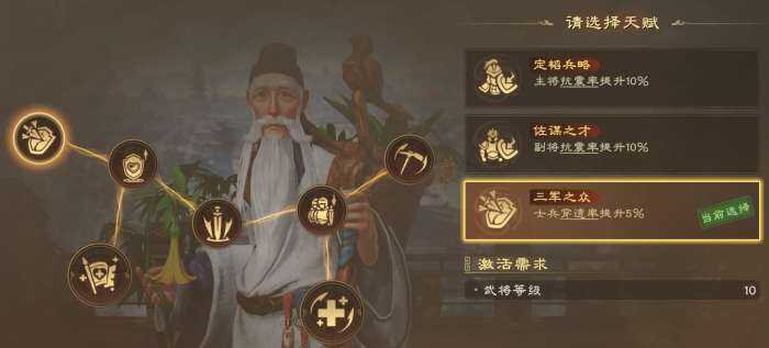 推荐路线:三军之众(提升穿透)→整旅厉卒(提升盾兵生命)→奇行之阵(携带生存阵法,提升恢复)→强而避之(提升技能抗性)→实而备之(提升普攻伤(shang)害(hai)抗性)→八方来援(提升治疗效果)→50级天赋(talent)(基(ji)于需求选择)