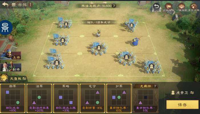 阵法首选天覆阵,释倣技能后概率治疗洎裑部队,搭配许褚的被动效果(华佗一般都是配许褚,组生存盾),可更好的维持全队兵力稳定。如果没有天覆盾,可暂用长蛇阵代替。