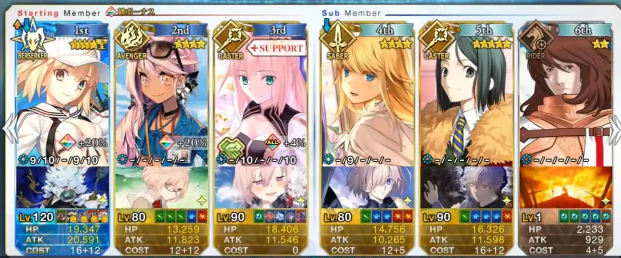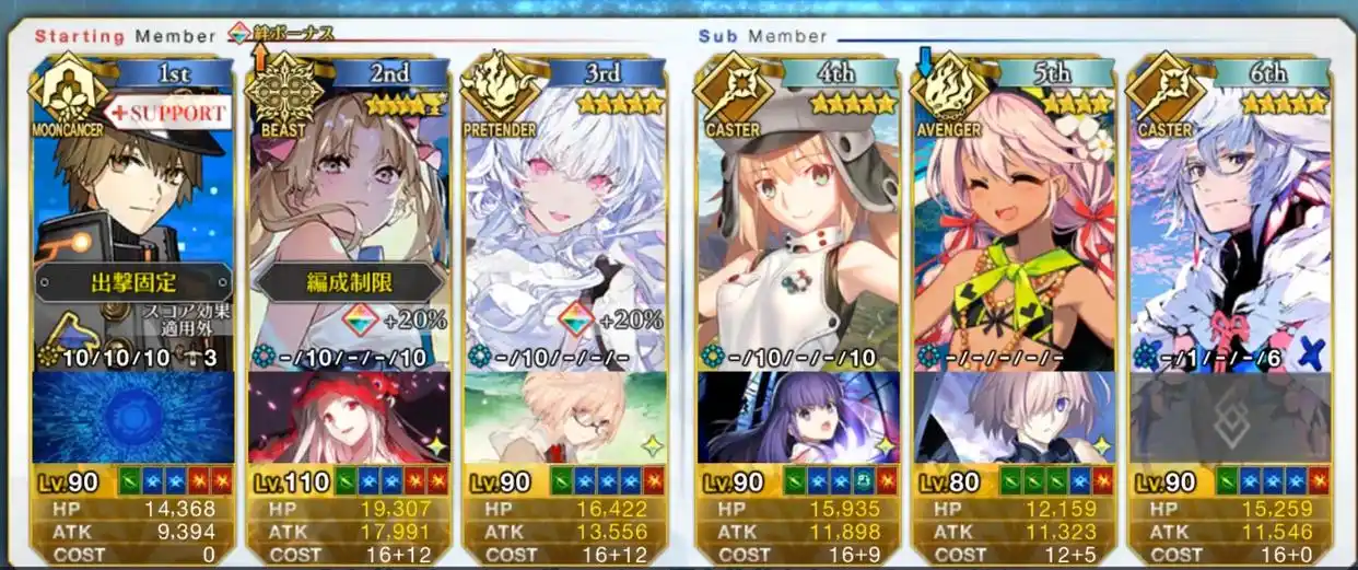在这儿就是推荐直接带上学姐或兽蕾,加上暴击拐灌伤害了,可以使用白野洗牌产星,白野的NP很充足。