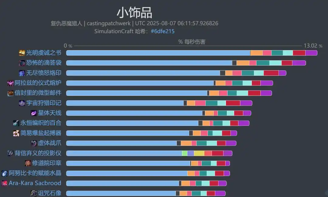 魔兽世界11.2复仇DH饰品选择复仇悪嚤猎手-单目(mu)标(biao),最佳(optimal)饰品滴答作响的恐慌之袋(塔扎维什,帷纱集市)和光明虔诚之书(圣焰修道院)。