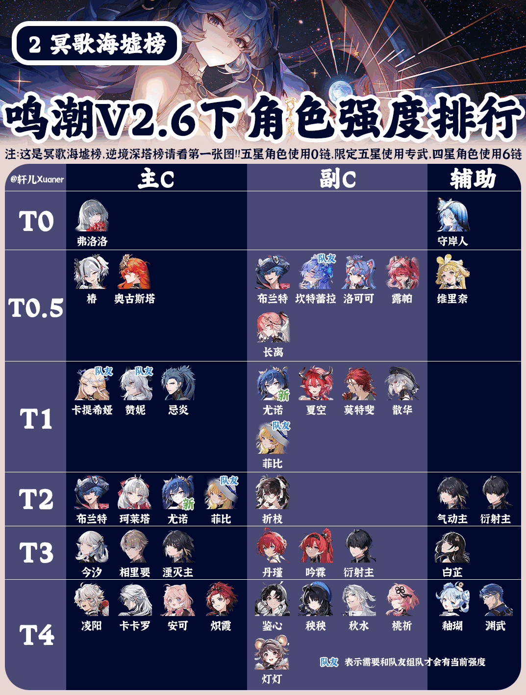 鸣潮V2.6下半全角色强度排行榜:① 本期冥歌海墟榜弗洛洛优先级提高(gao),弗洛洛表现特别强势,根据(ju)冥歌海墟目前环境,相对弗洛洛对其它角色进行了下降调整。