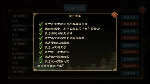 在关中地区(area)存在都城或陪都时,将生成(shengcheng)“建号有秦”战(zhan)略(lue),若我方为王朝天子、量级达到(dadao)战国,且统一了关中、陇西、商洛地区(area),则满足更改条件。