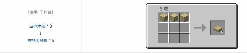 我的世界游戏里面的白桦木台阶合成方法:需要材料方法(fangfa)个白桦木板可以获得6个白桦木台阶,可使用方法(fangfa)个对应方块合成获得或使用获得个对应方块在切石机切石获得。
