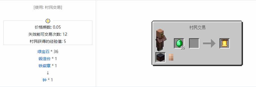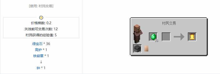 钟自然生成于村庄中心,与工具商和武器商交易也可获得(available),价格为 36 个绿宝石。
