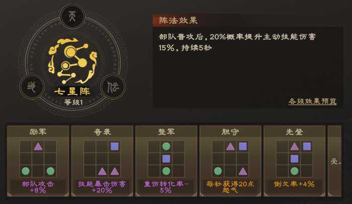 七星阵拥有相对稳定的增伤能力,契合于大多数技能系阵容,比较适合开荒使用。例如赵云、吕布、黄忠等武将(wujiang)都可以选择这个阵法,后续有机会可提升阵法等级,从而获取更高加成(addition)。