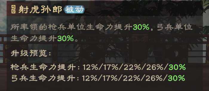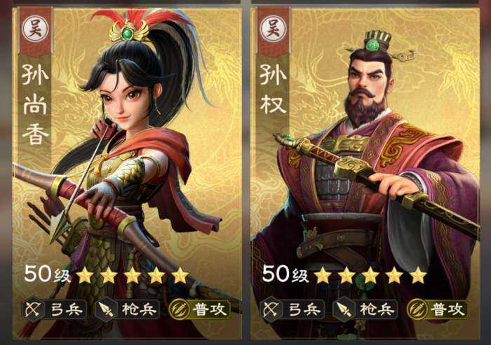 每个武将(wujiang)都有擅长率领的兵种,配置擅长兵种可提升战力系数。比如我们“孙权+孙尚香”的普攻流配置,就可以选择前排枪兵+后排弓兵的配置。